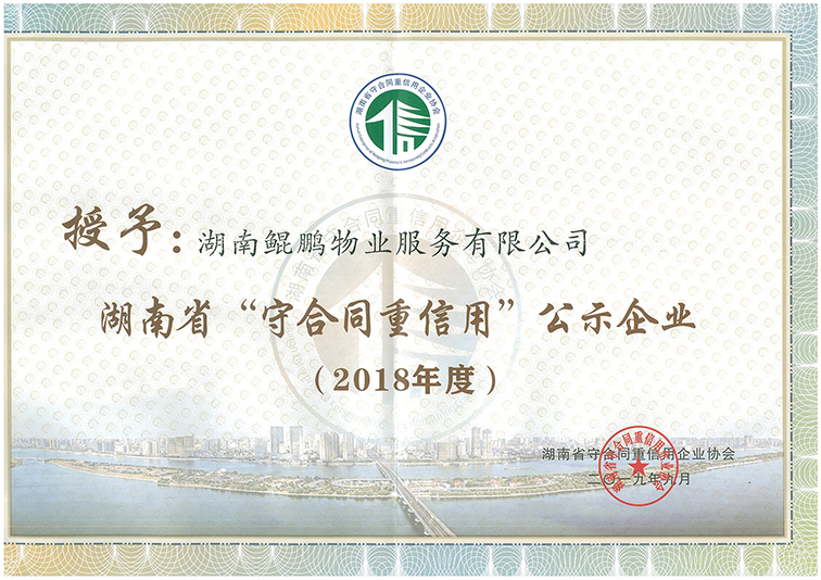 喜報丨鯤鵬物業(yè)榮獲2018年度湖南省“守合同重信用” 稱號