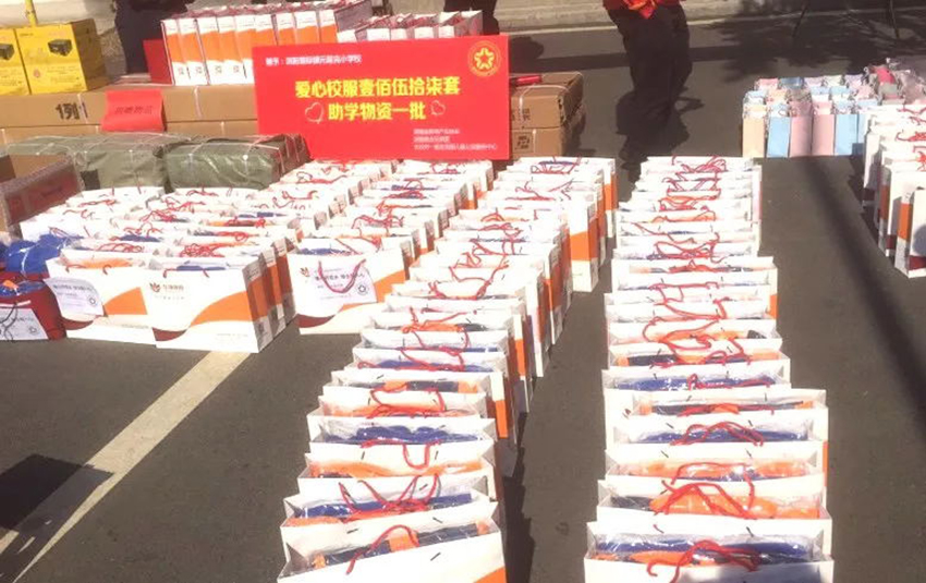 在充滿溫情的為孩子們更換了新校服之后,飽含愛心的助學(xué)款和禮物也送到了孩子們手中。元霞完小學(xué)校的少先隊(duì)員們?yōu)閻坌娜耸繋硝r艷的紅領(lǐng)巾,充滿喜悅,表達(dá)最真摯的感謝。